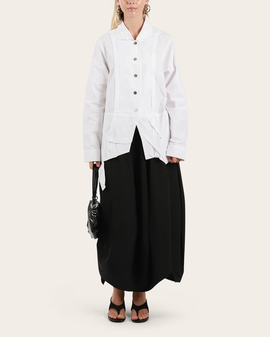 A cotton shirt featuring a classic collar, long wide sleeves, mother of pearl buttons at front to close, insideout look with visible stitching detail all over, asymmetrical hem, mother of pearl buttons at cuffs.