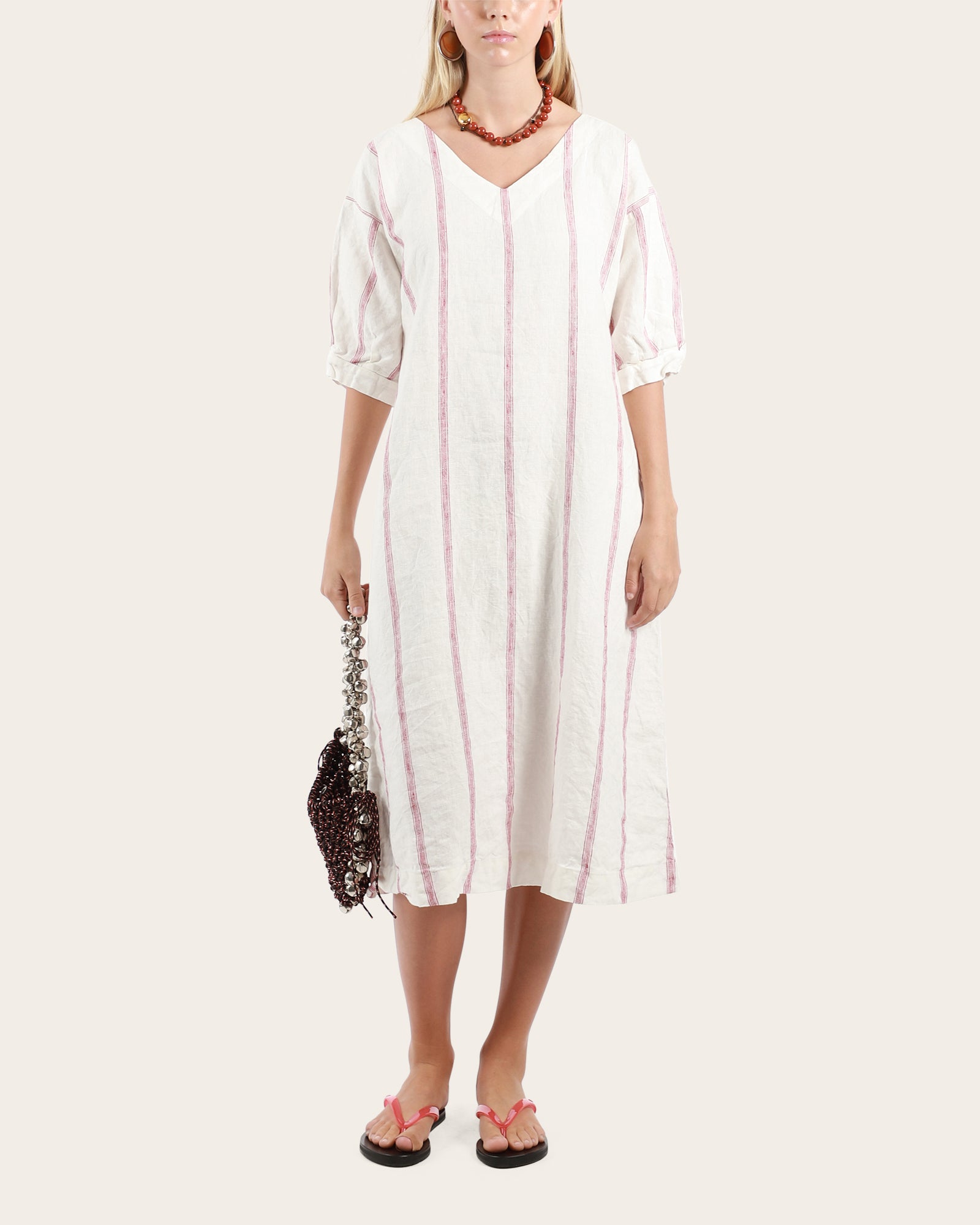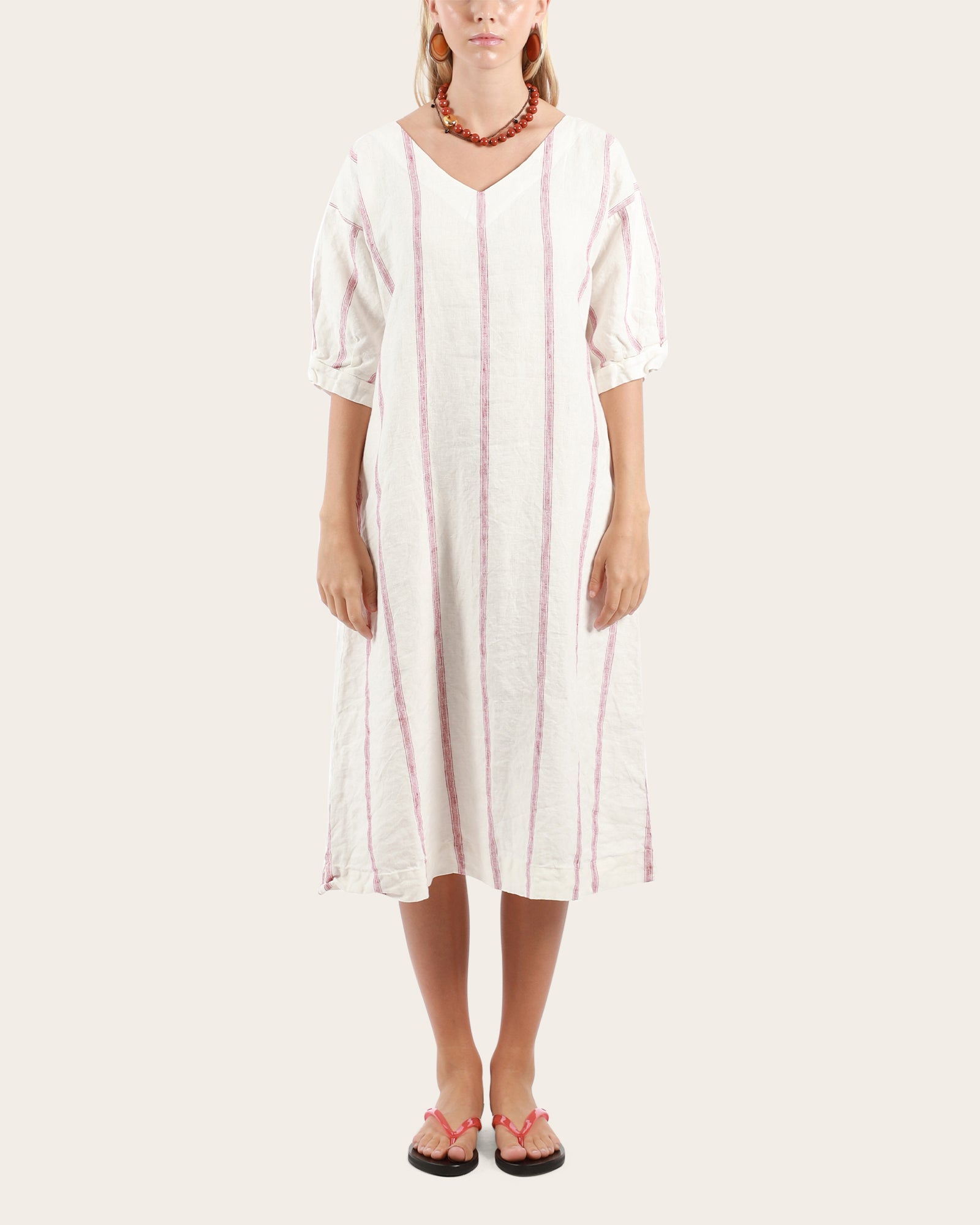 This breezy linen midi dress features a relaxed silhouette with soft vertical stripes in a muted rose hue, creating an effortlessly elegant look. Designed with a flattering V-neckline and gently gathered half sleeves, it offers both comfort and understated style. The lightweight, textured fabric drapes naturally, making it perfect for warm-weather days or easy, everyday wear.