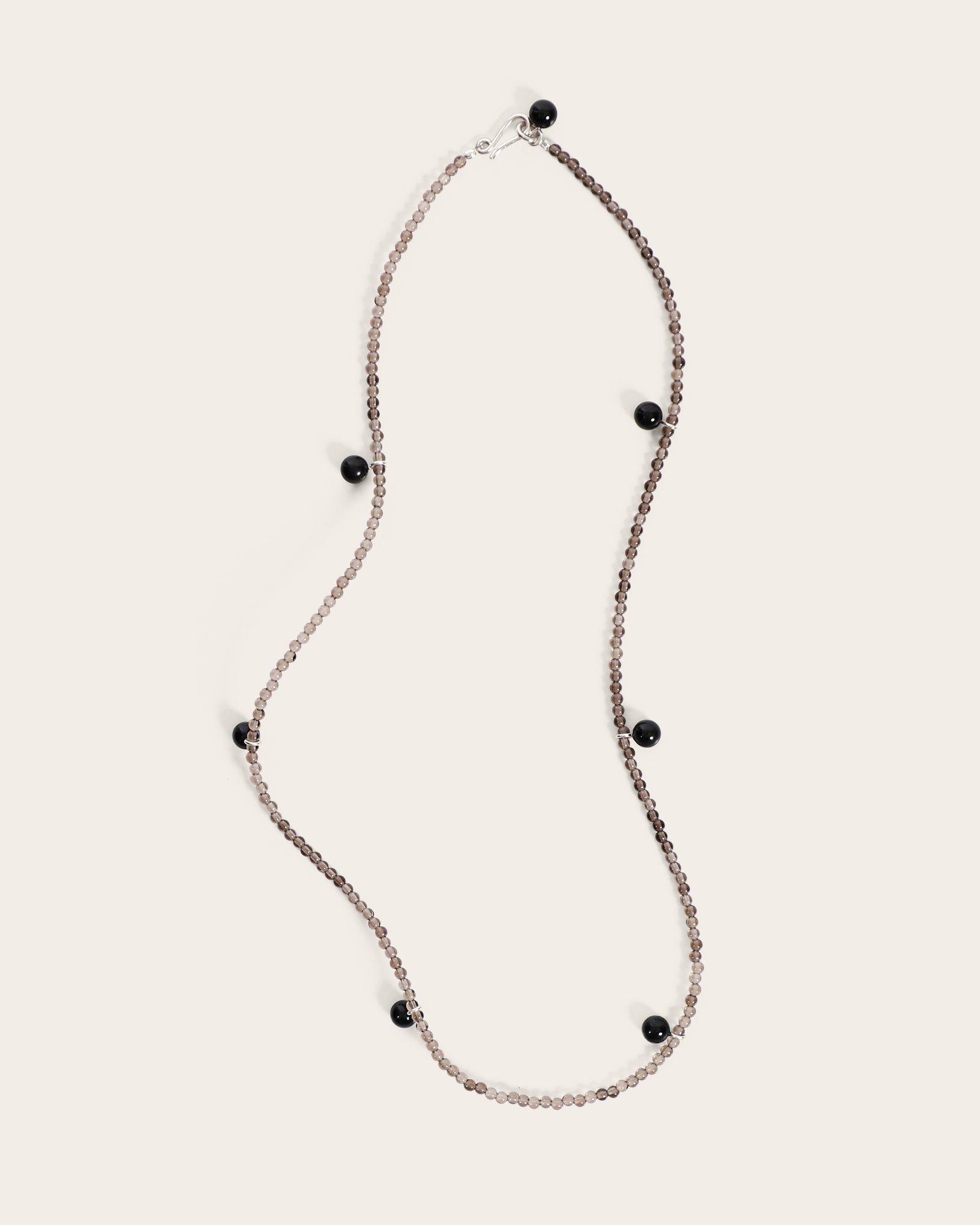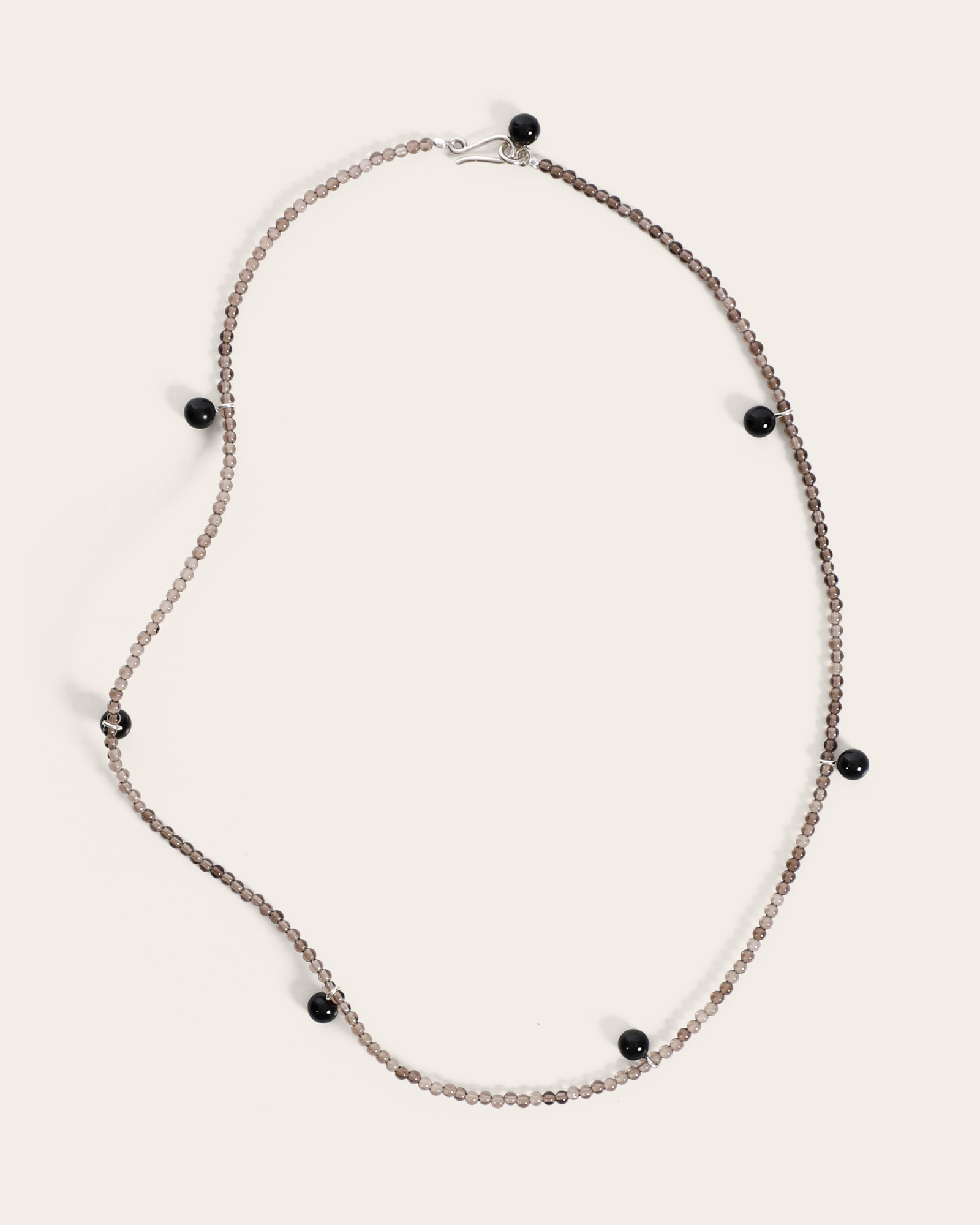 • The Smoky Tiny Dew Necklace features hand-cut beads that drape effortlessly around the neck, evoking both the warmth of summer nights and the fresh clarity of a spring morning.