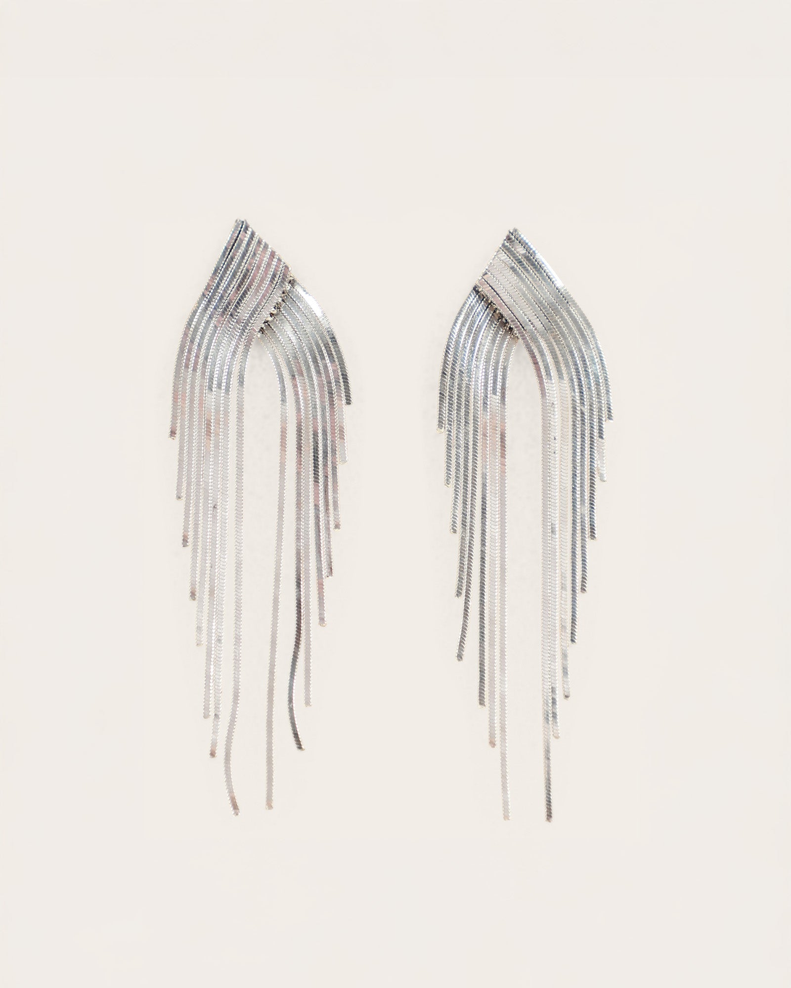 • Sterling silver earrings that cascade gracefully from ear to neckline. Lightweight and flexible, they offer a delicate yet striking frame for the face.