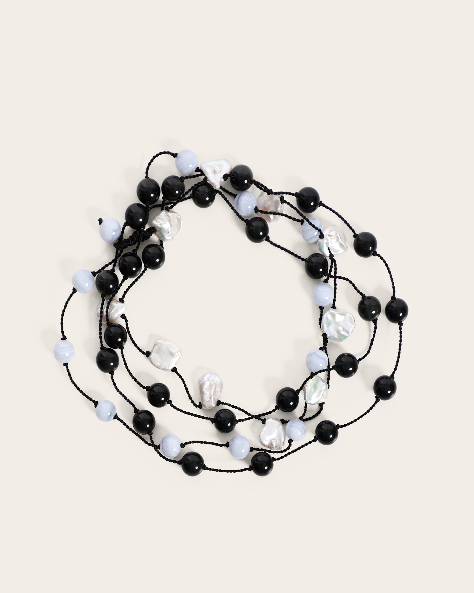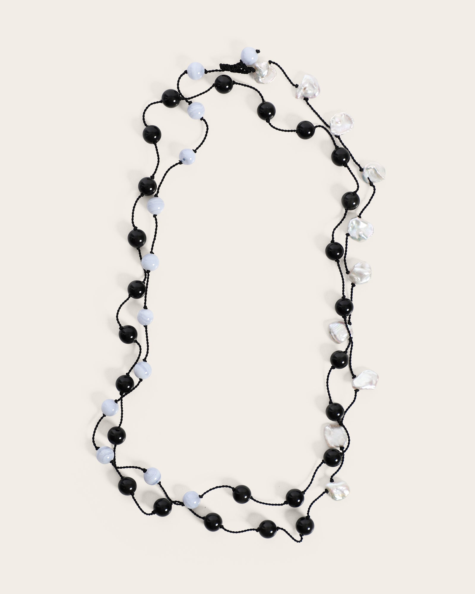 Composition: Silk thread, Keshi Pearls and Stone (Chalcedony and Onyx spheres)