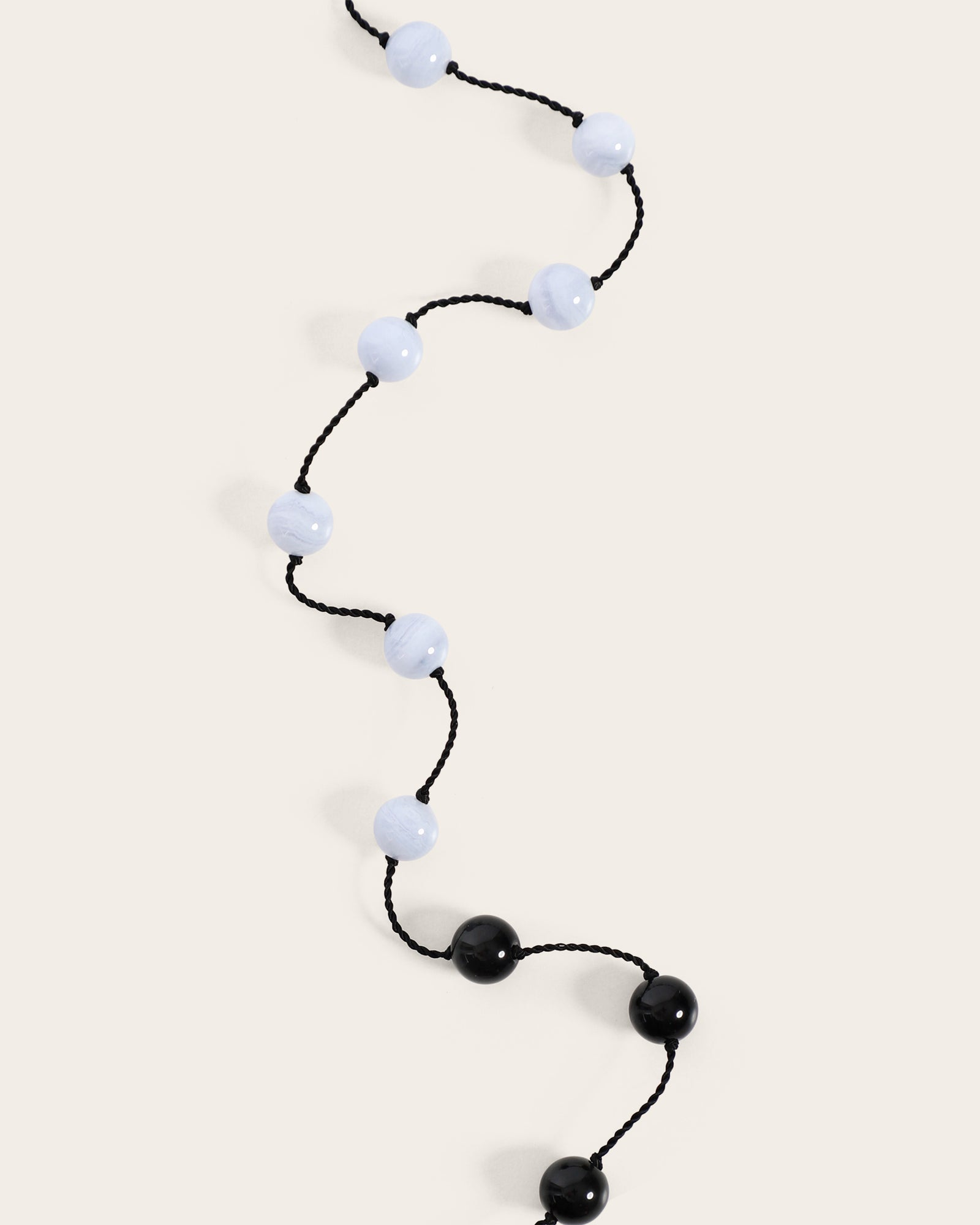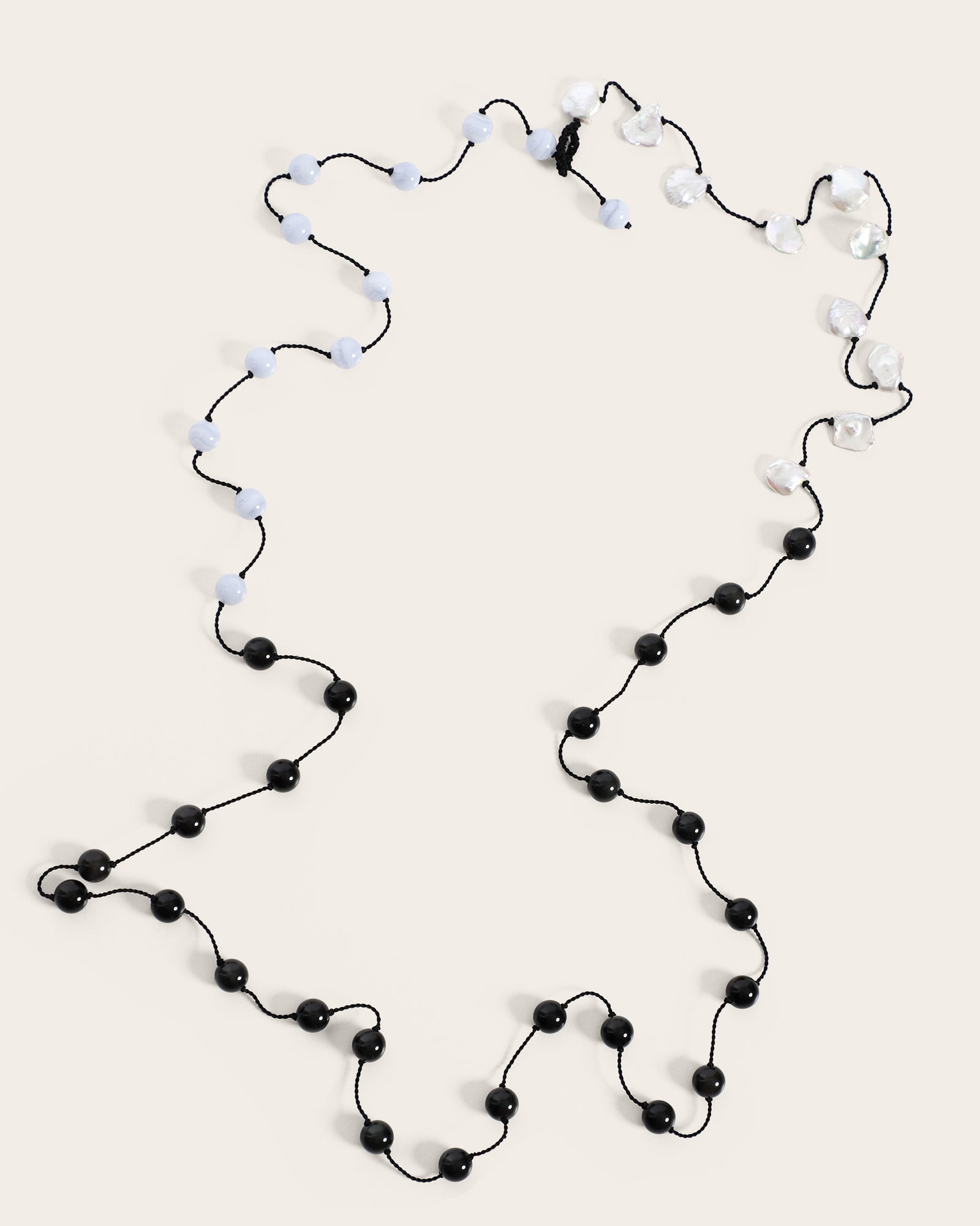 Harmoniously intertwined, these elements create a dynamic layer for any look. Knotted onto silk cord, this piece is truly greater than the sum of its parts.