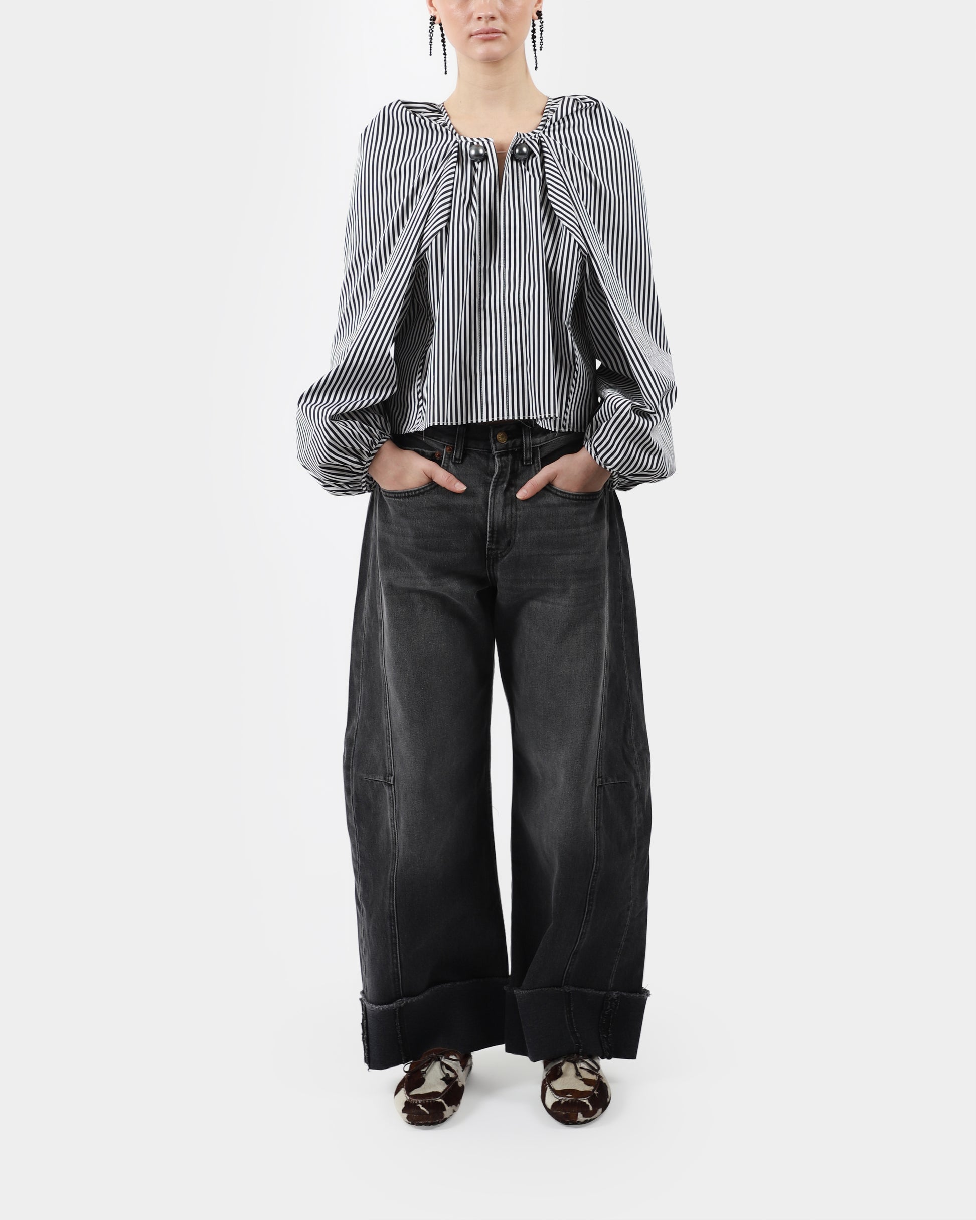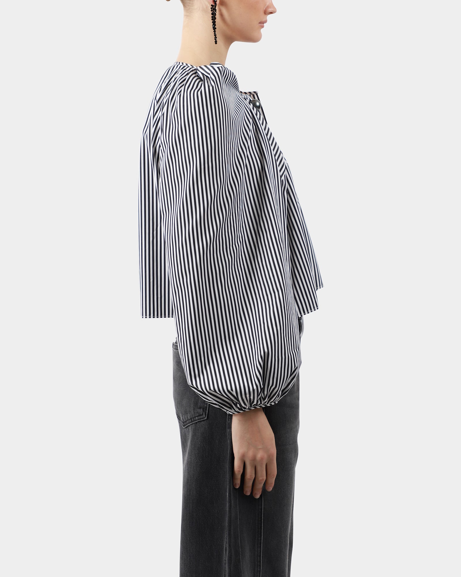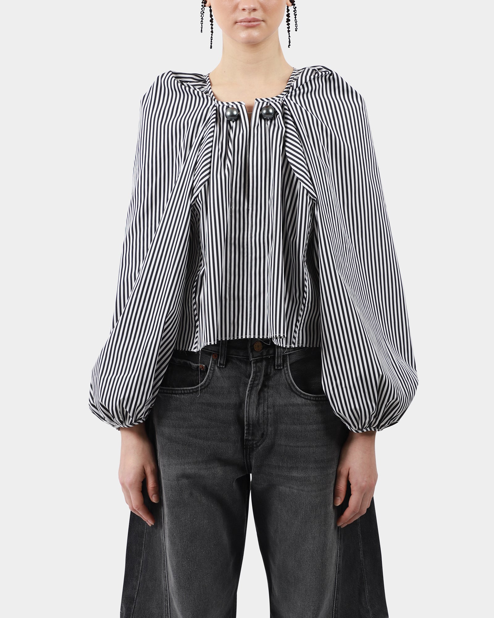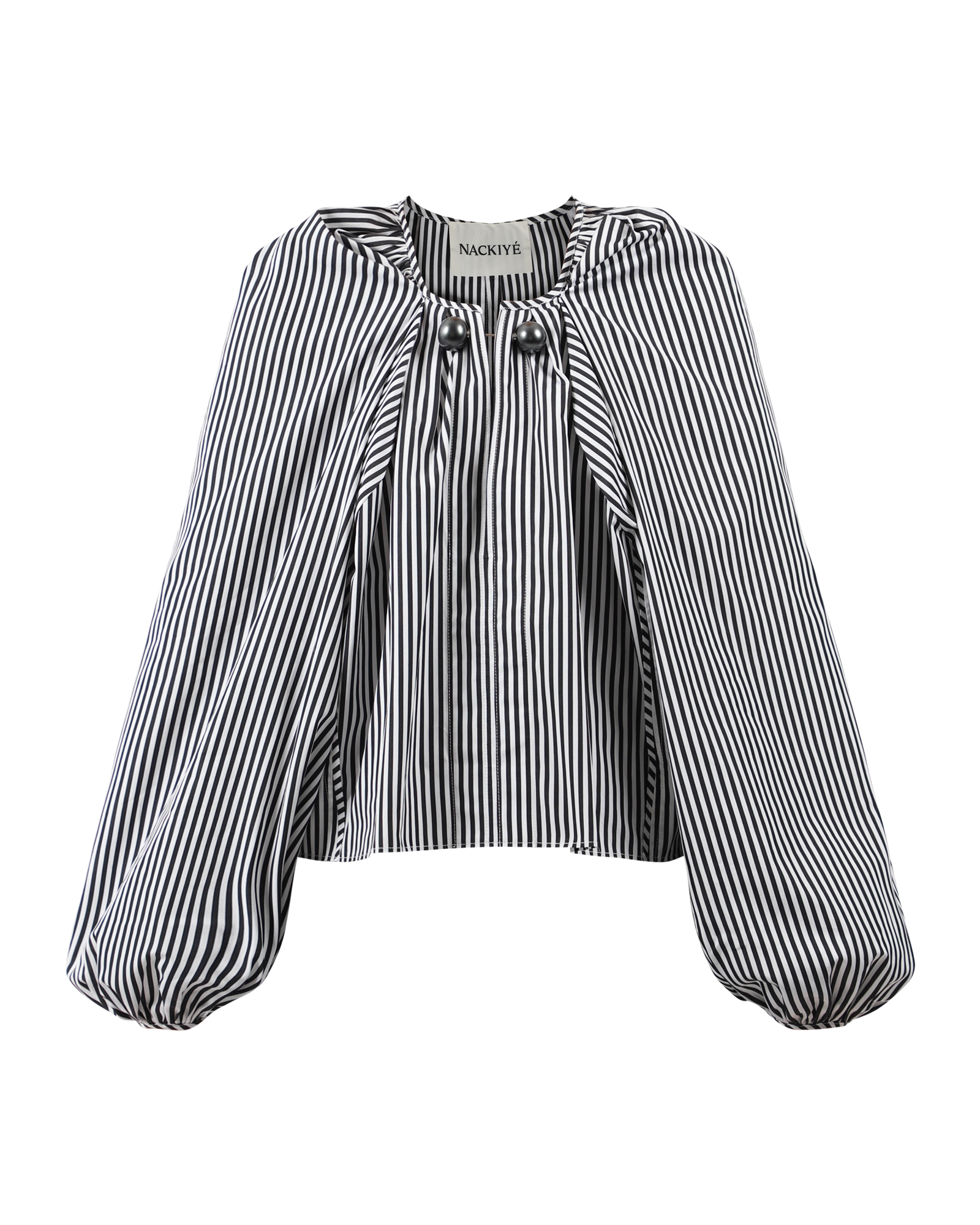 This iconic Grand Bazaar Top from Nackiye features shawl shoulder, mini double pearl neck pin, raw hems, cream frill edging, and signature 'N' embroidery. Made in Turkey.