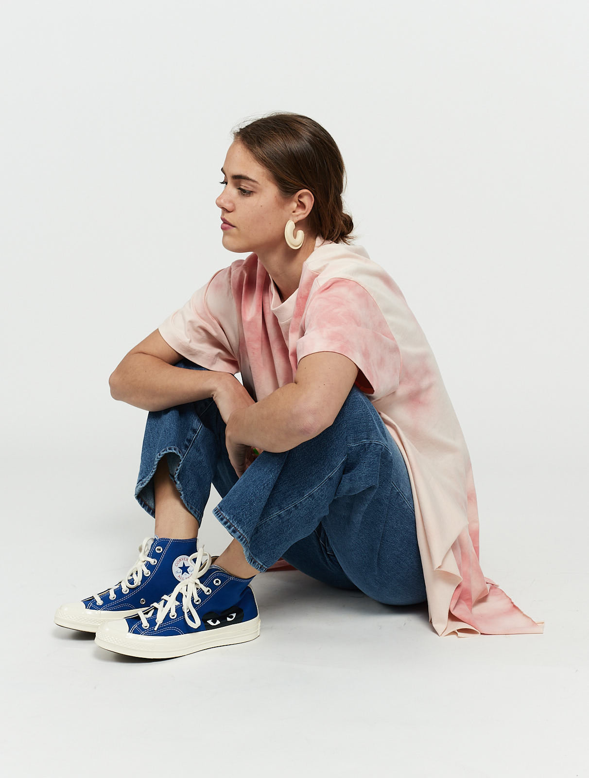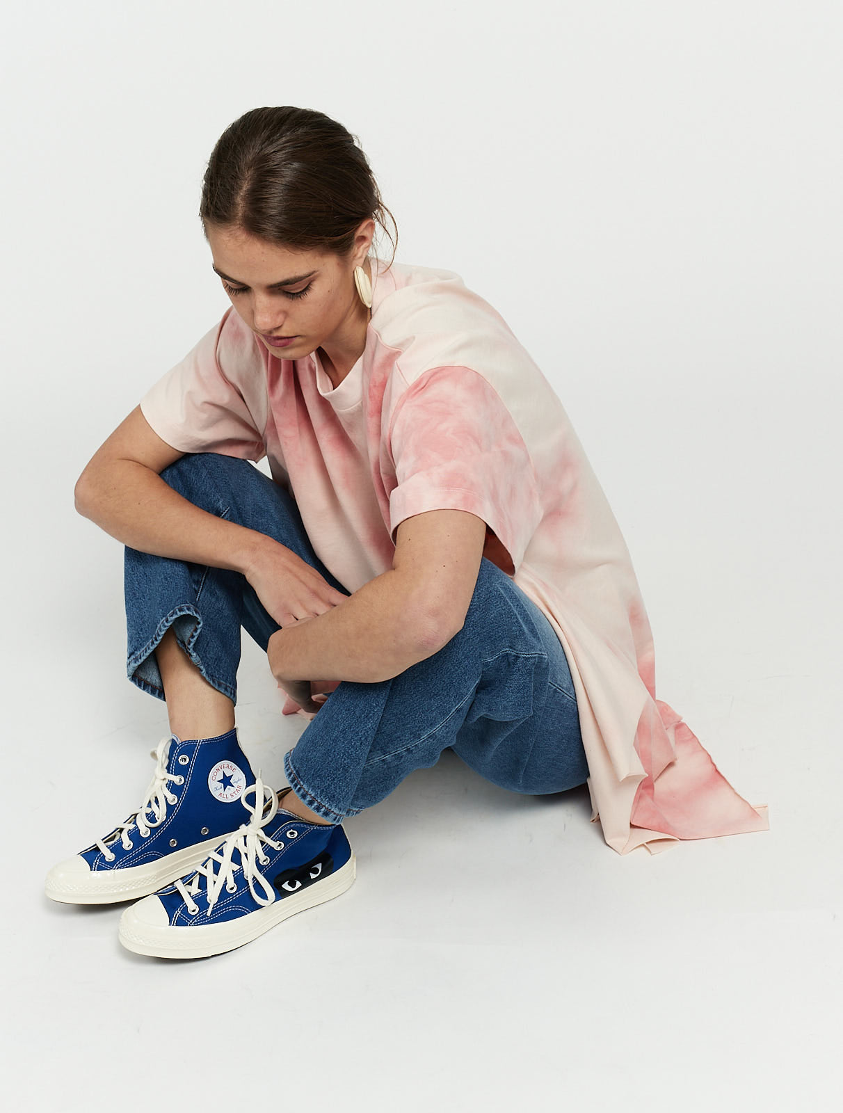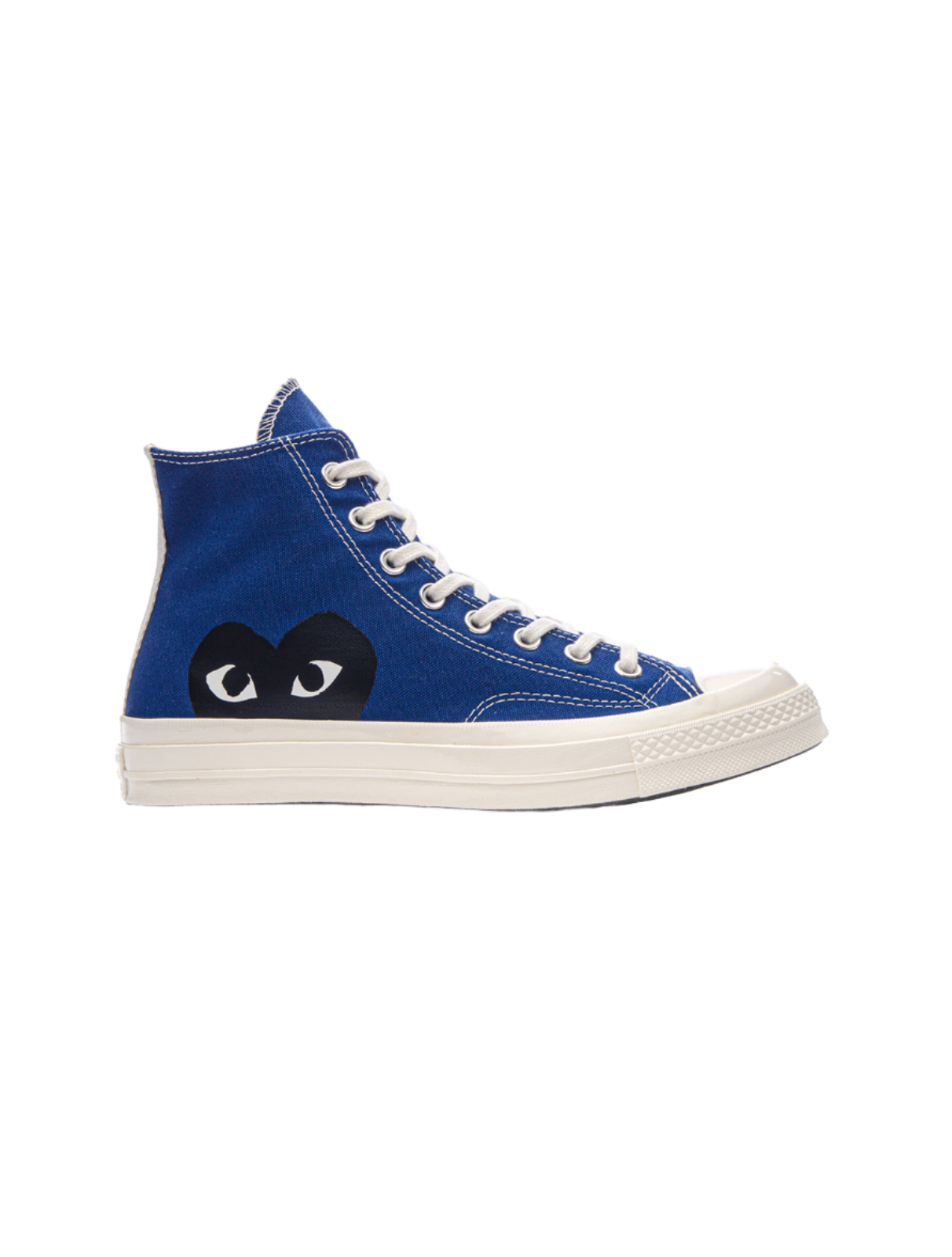 Blue canvas Converse Chuck Taylor hi top sneaker from Comme Des Garçons Play featuring front lace-up fastening and signature heart logo at side in black.