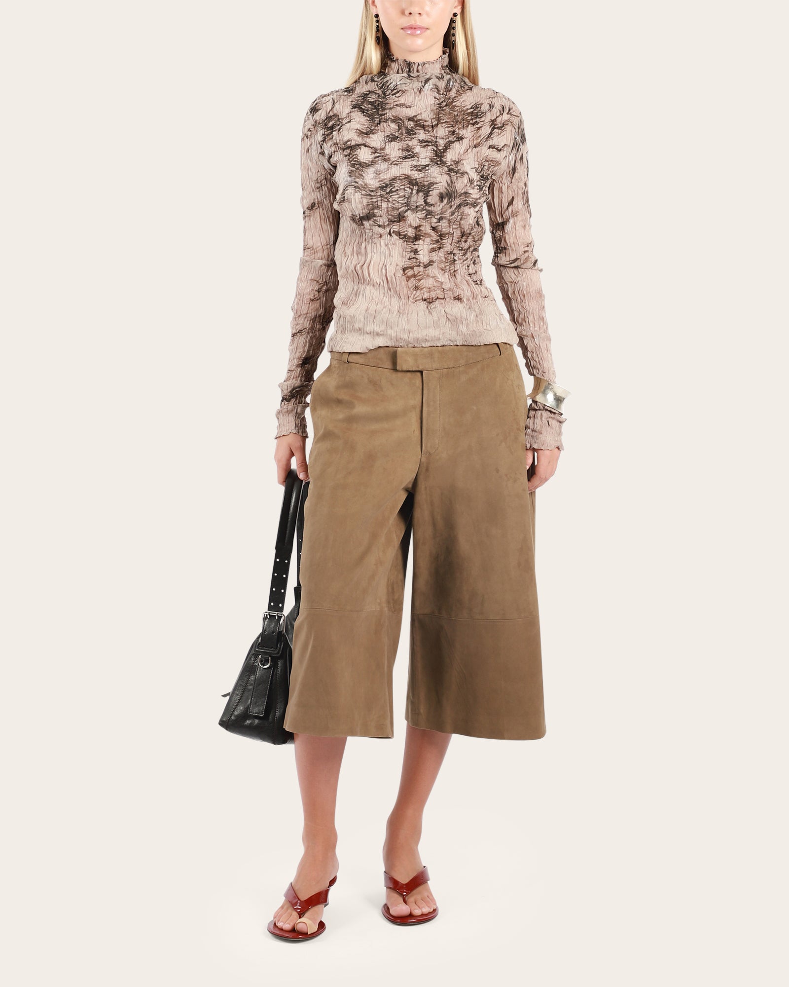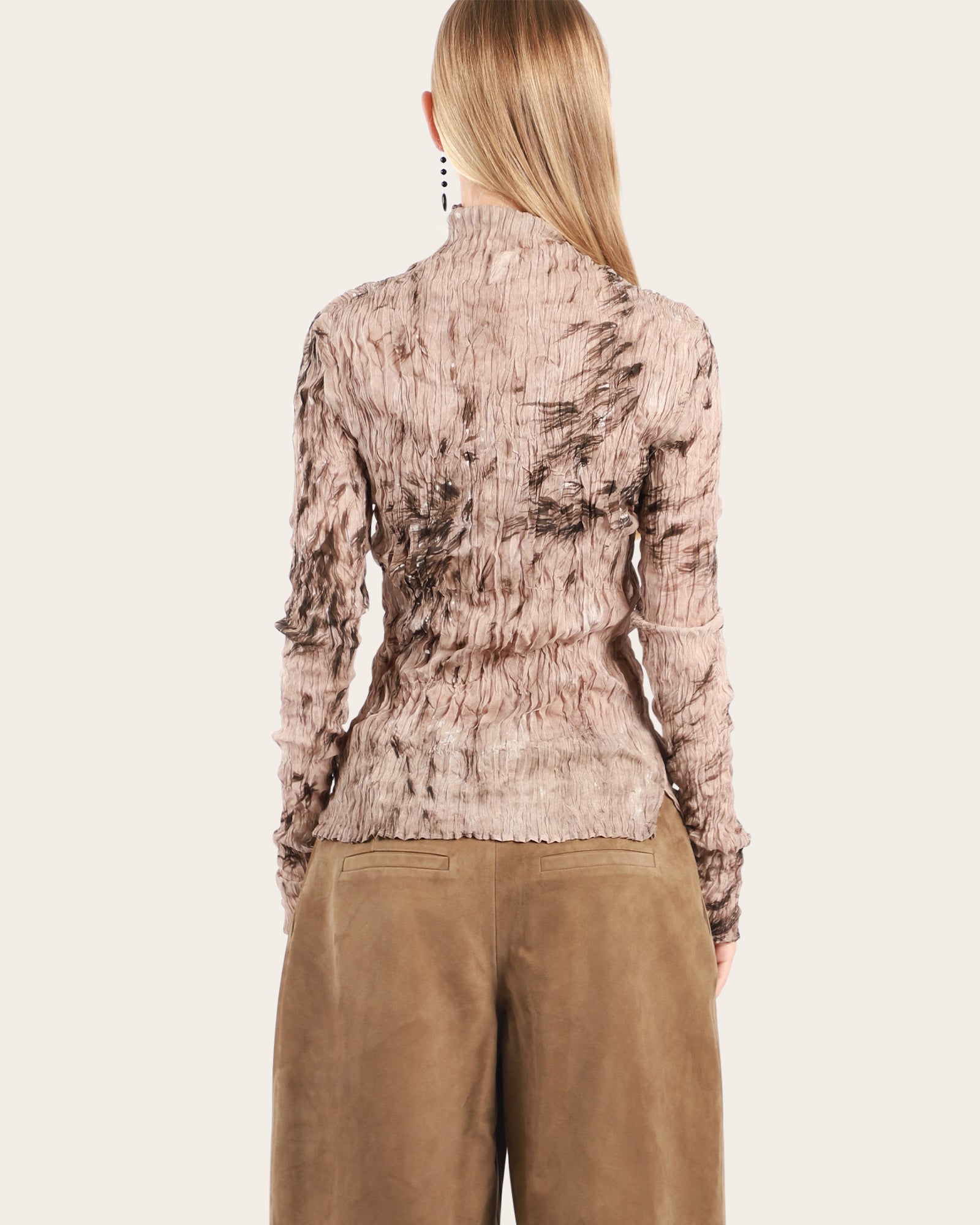 Crafted from luxurious crushed silk, this timeless style gains added texture and depth, elevating its classic appeal. Now designed with long sleeves, it’s perfect for layering under jackets or wearing on its own for a sophisticated, effortless look.