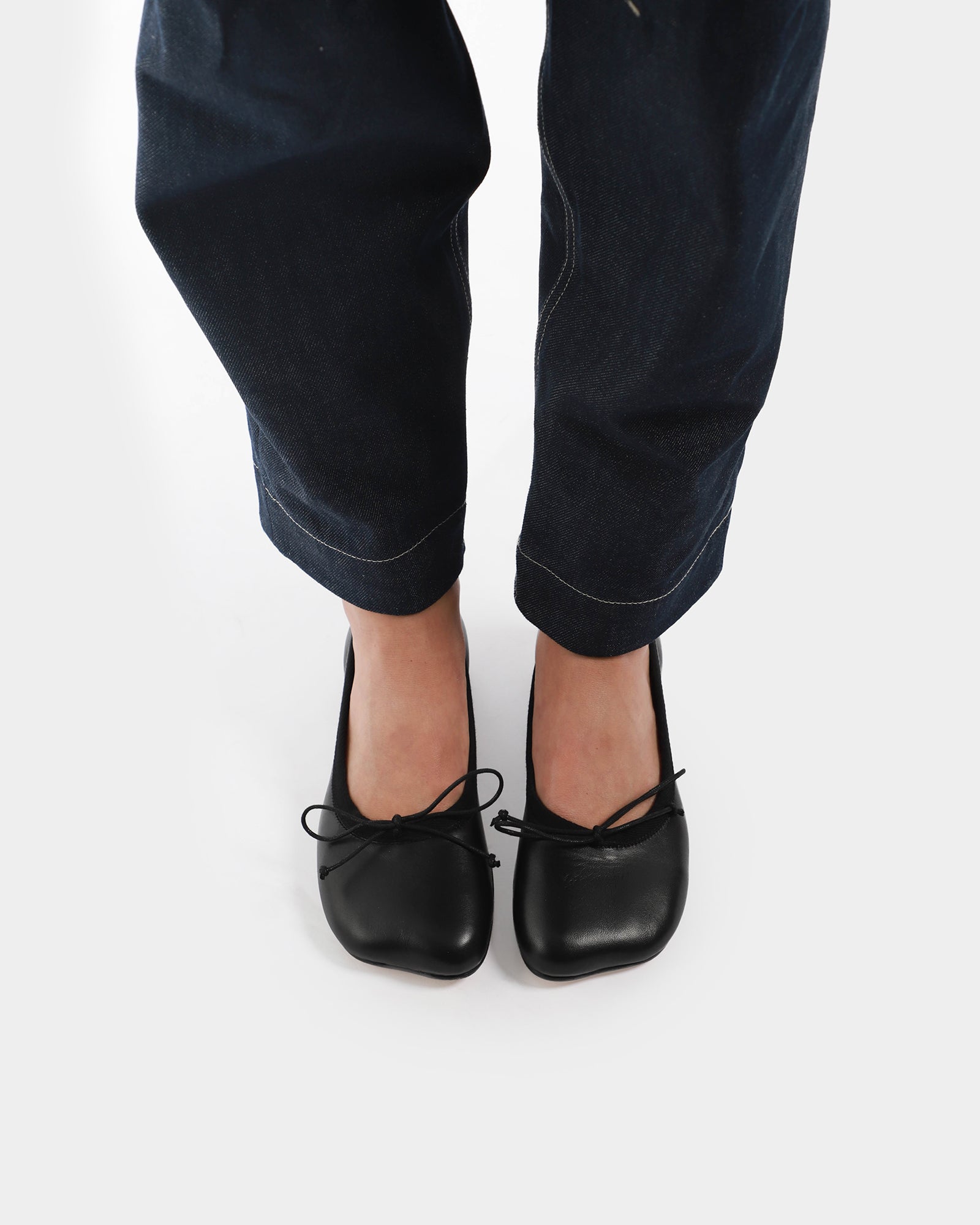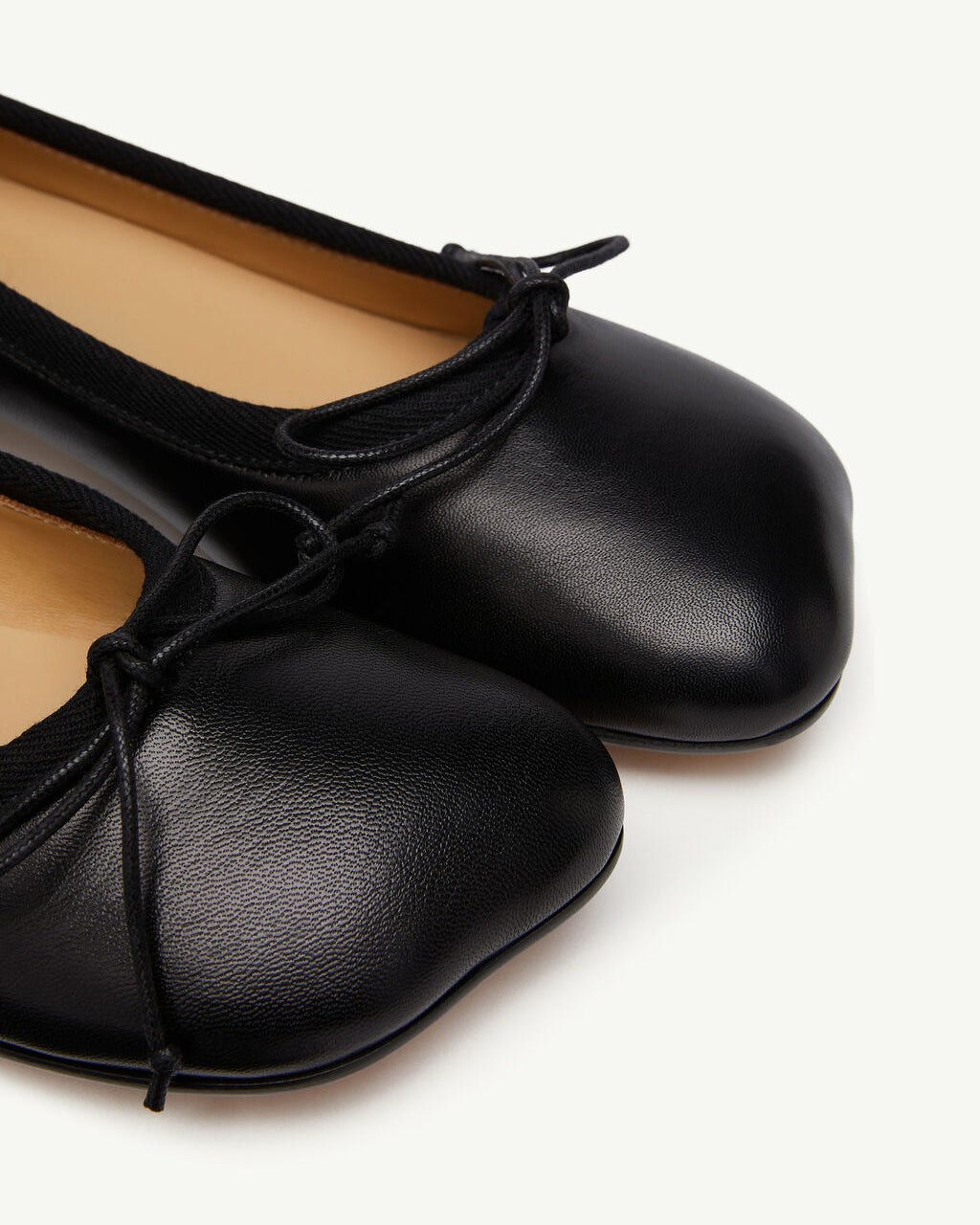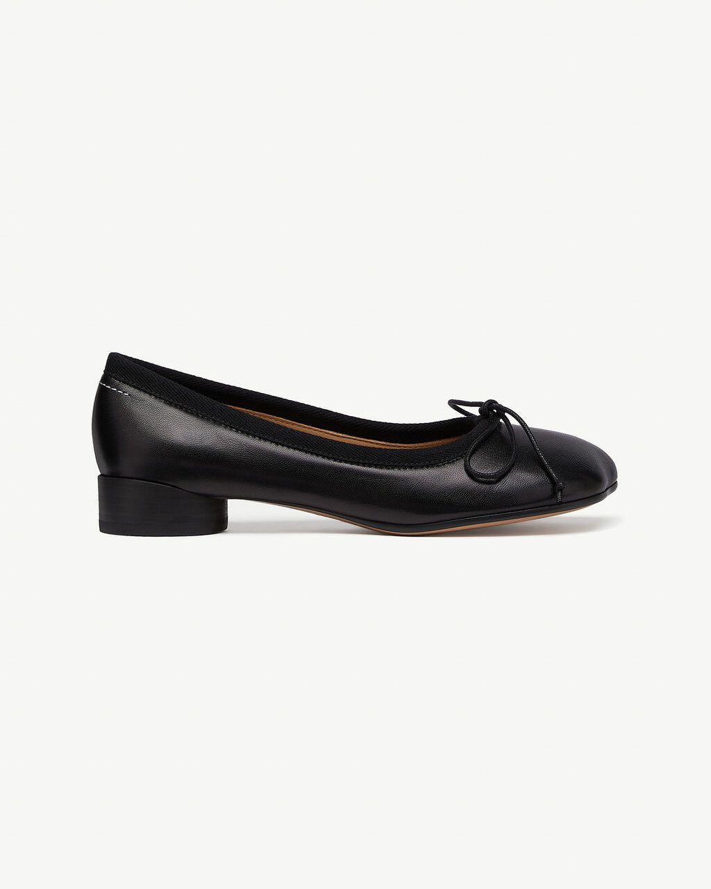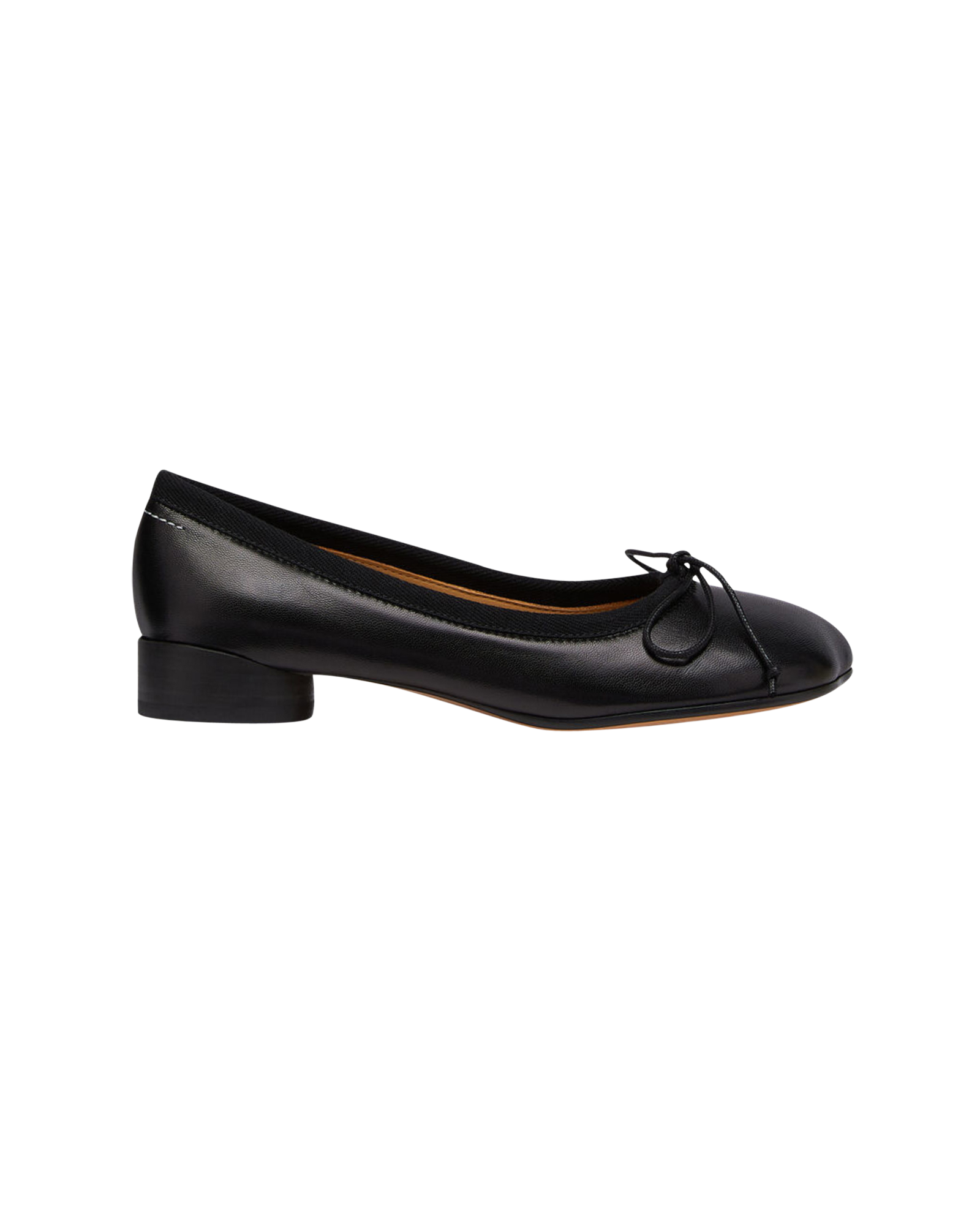 MM6 Maison Margiela ballet slippers in soft nappa leather, featuring iconic anatomic design, bowtie front detail, rounded block heel, MM6 signature horizontal white stitch line at back heel, shoes simply slip on.