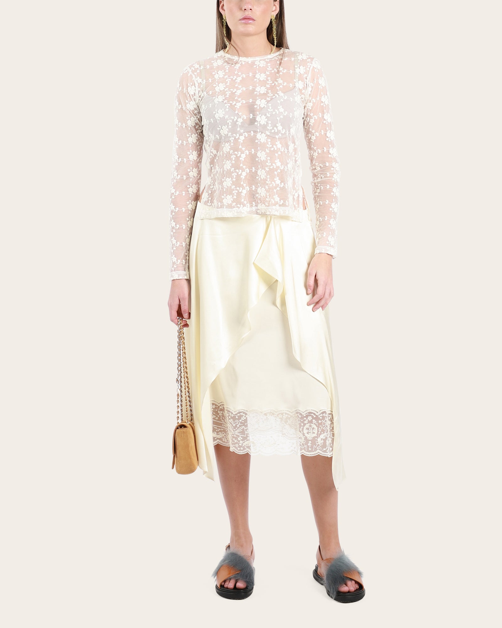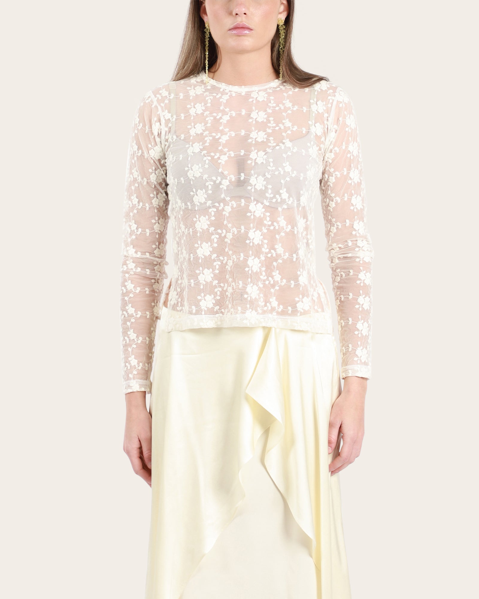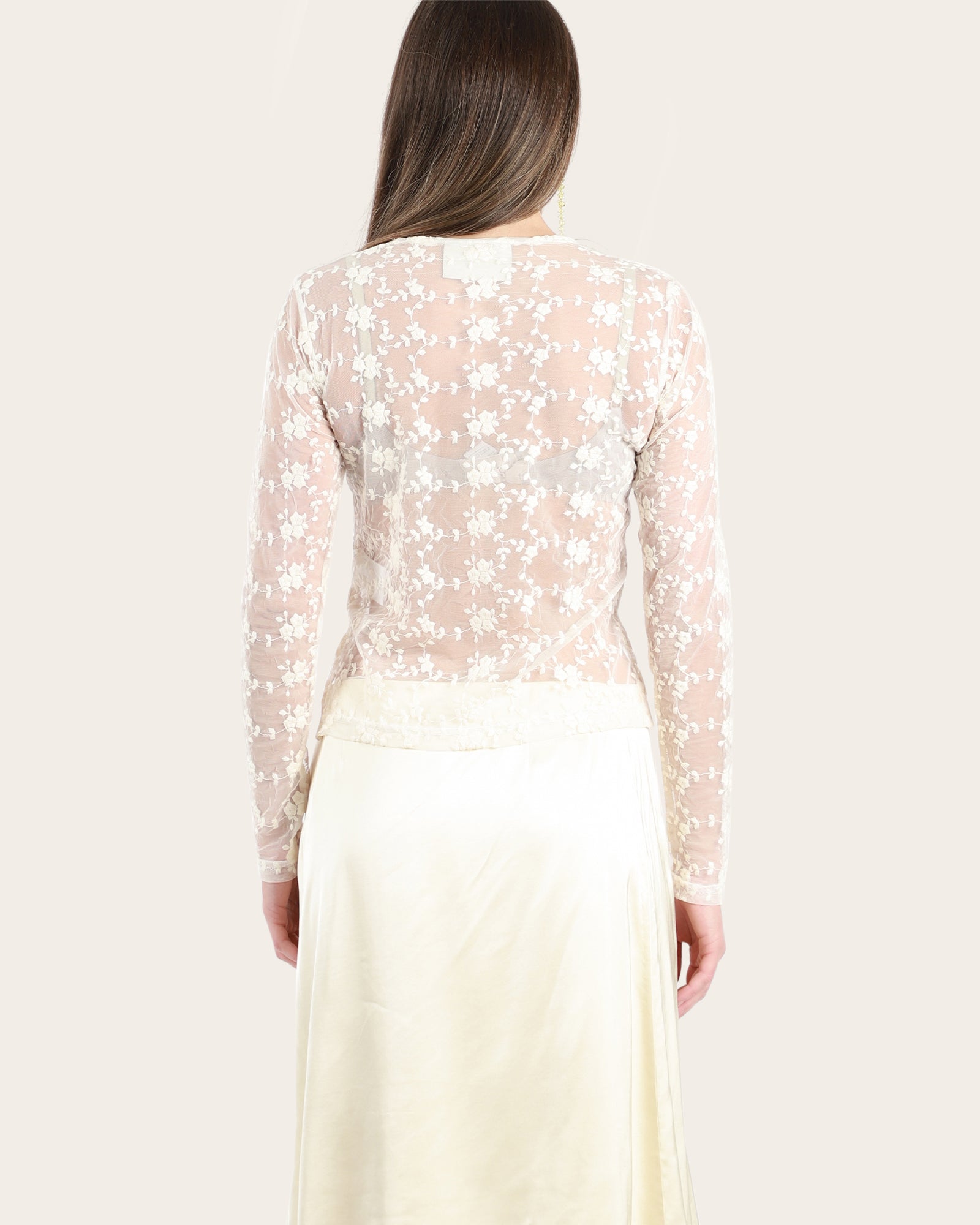 A delicate layering piece defined by texture and transparency, this fitted long-sleeve top is crafted from sheer ivory mesh embroidered with an intricate floral motif. The lightweight fabric softly contours the body while allowing the pattern to subtly stand out against the skin. Designed with a clean crew neckline and elongated sleeves, the silhouette feels both refined and effortless. Worn alone or layered over tonal underpinnings, it brings softness and dimension to seasonal dressing.