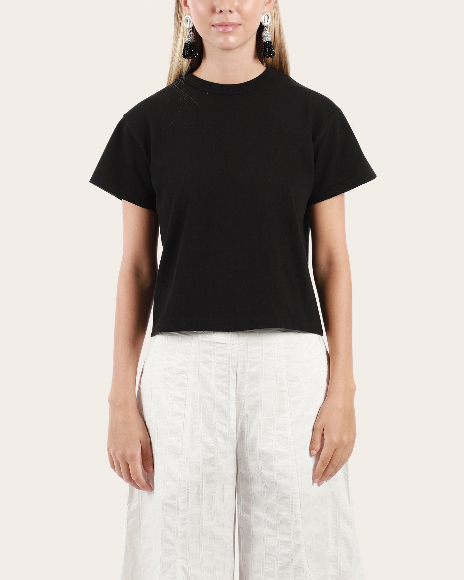 The Sunray Hi'Aka Short Sleeve T-Shirt features a round neckline, short sleeves, and a cropped fit with ribbed finishing. Crafted using an antique circular knitting machine, this slow knitting process eliminates side seams and prevents tension on the yarn, ensuring the garment maintains its shape over time. Made from 100% recycled Ochiwata Jersey cotton (260GSM), this Beluga Dark Grey tee combines sustainability with exceptional quality. Measuring approximately 54cm from neckline to hem, it is proudly made in Japan.