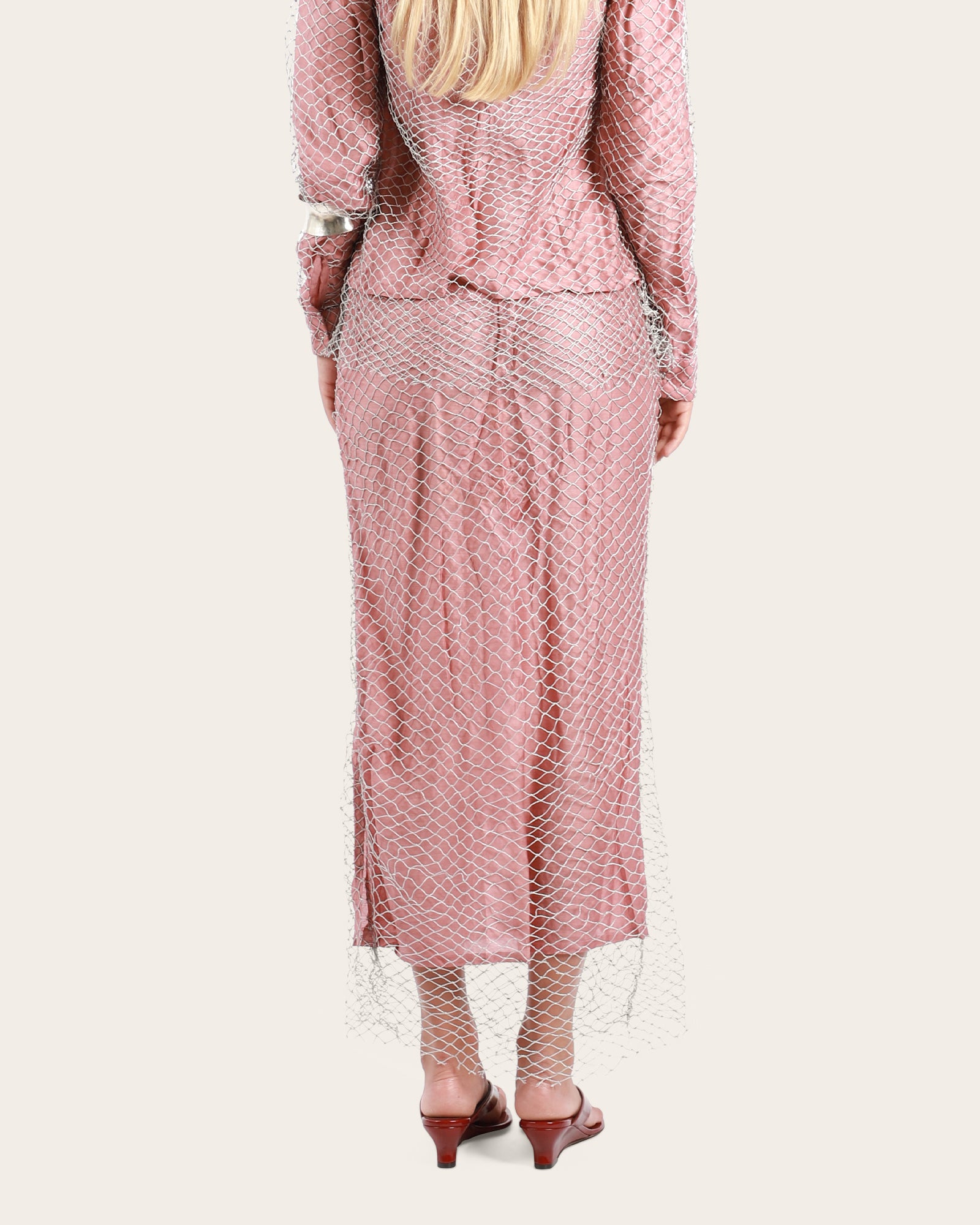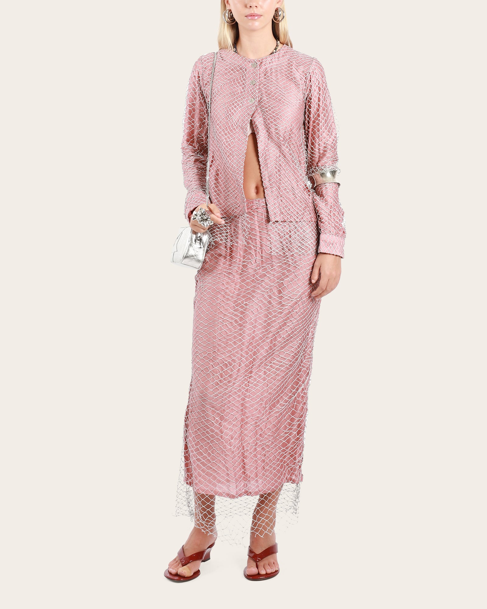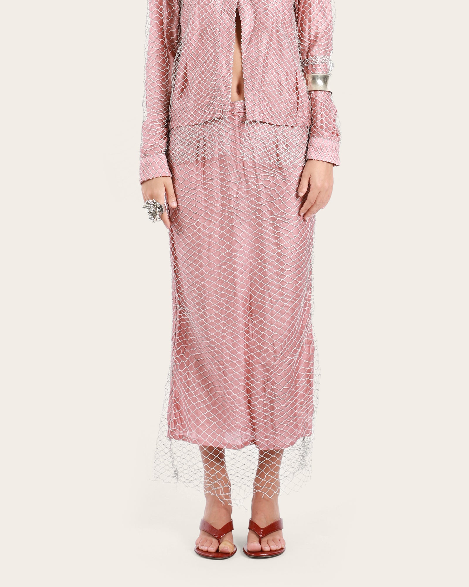 A fluid midi skirt in a soft blush tone, layered with an allover crystal mesh overlay for subtle shimmer and texture. Cut to fall straight through the body, it drapes effortlessly while the sheer netted hem adds lightness and movement. Designed to pair seamlessly with the matching top or styled on its own for understated impact.