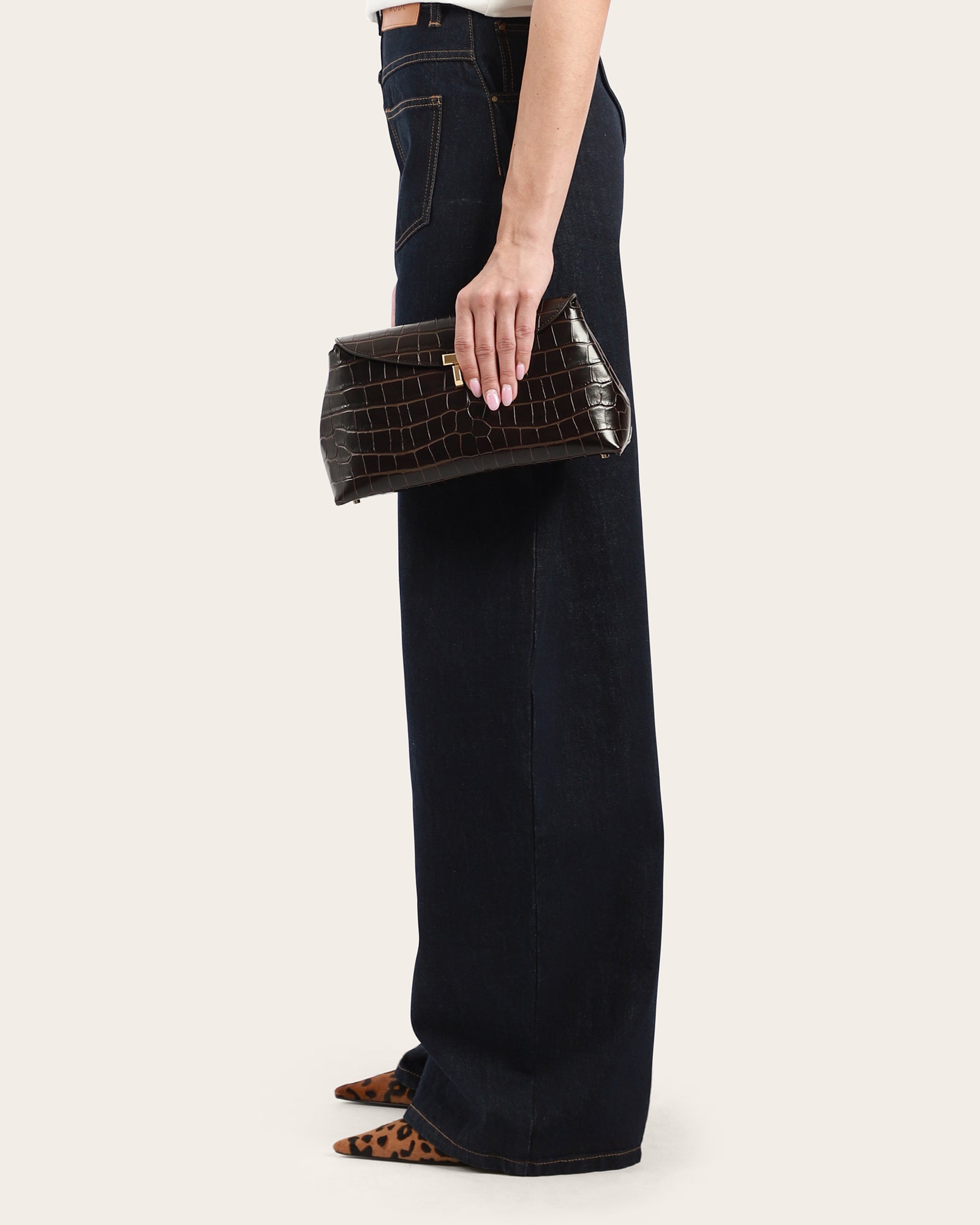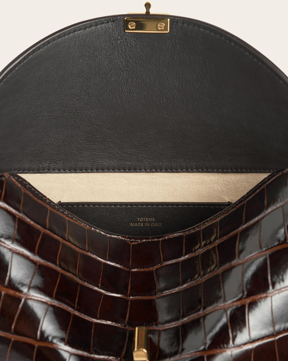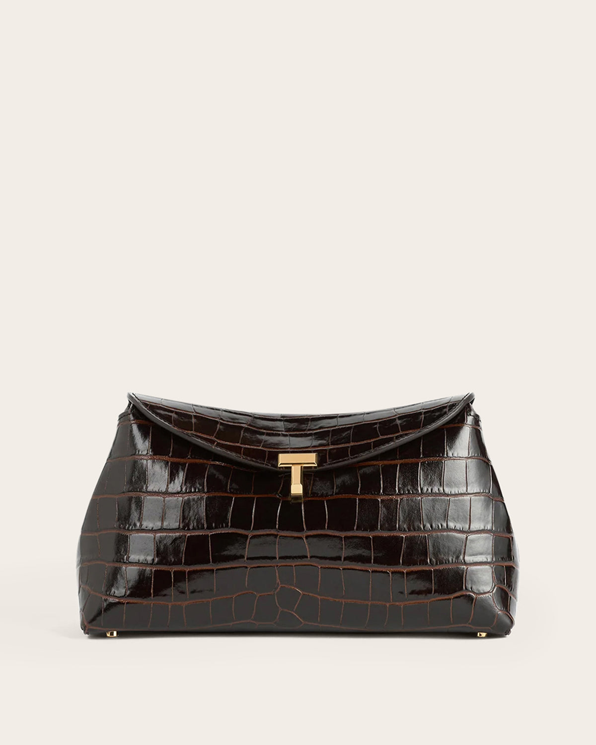 The sculptural T-Lock clutch by TOTEME is defined by its distinctive curved flap and signature gold-tone twist lock closure. Expertly crafted in Italy from glossy crocodile effect leather, it opens to a compact interior with a built in card slot. Carry it by hand for an elevated look, or attach the optional strap to wear it crossbody.