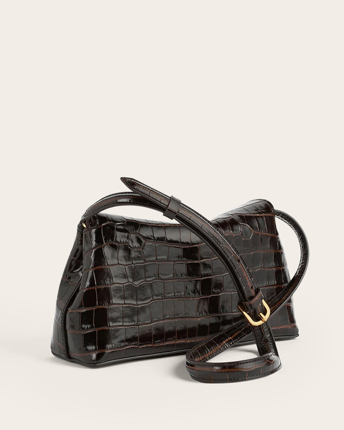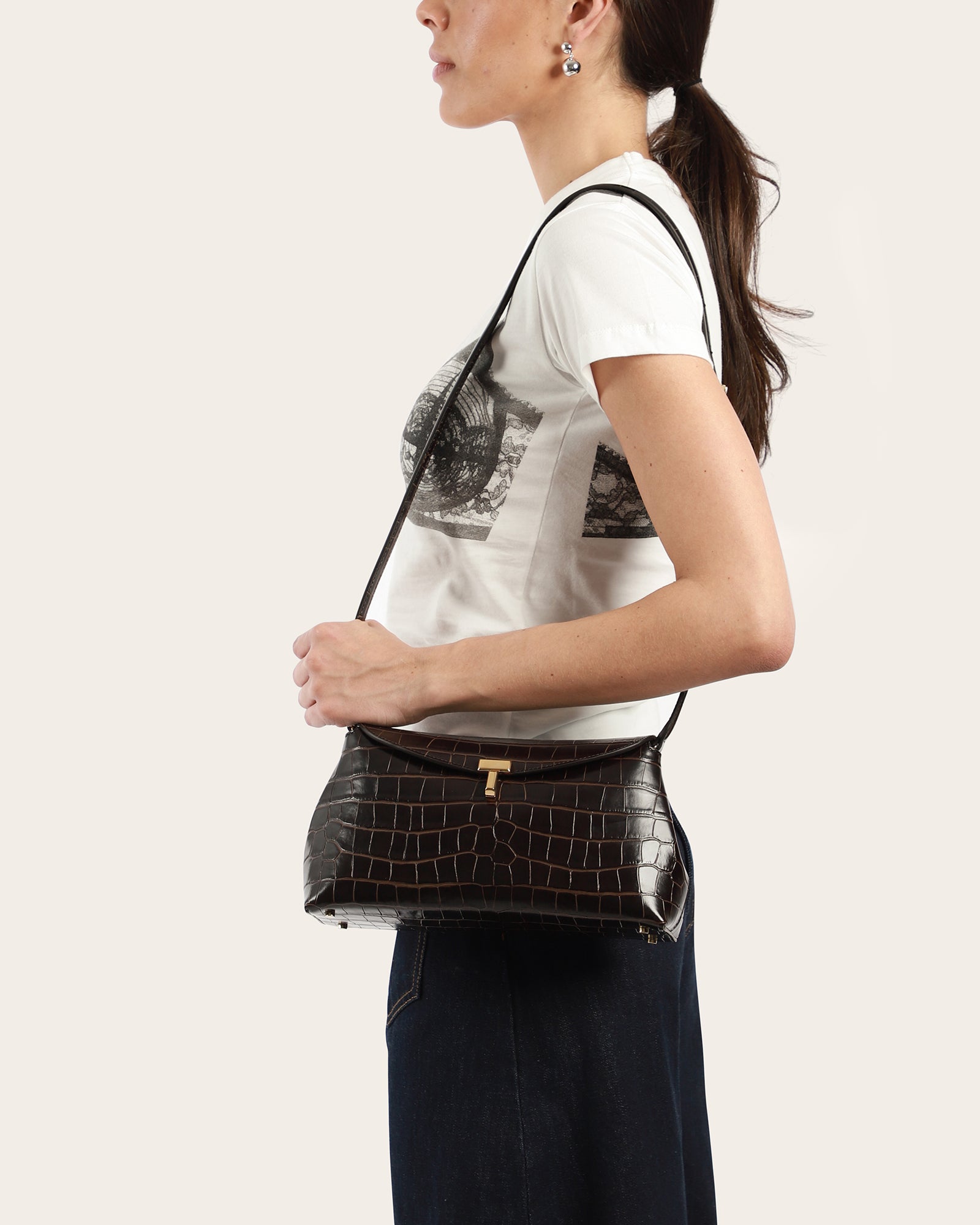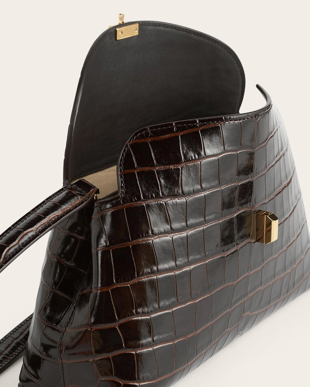 The sculptural T-Lock clutch by TOTEME is defined by its distinctive curved flap and signature gold-tone twist lock closure. Expertly crafted in Italy from glossy crocodile effect leather, it opens to a compact interior with a built in card slot. Carry it by hand for an elevated look, or attach the optional strap to wear it crossbody.